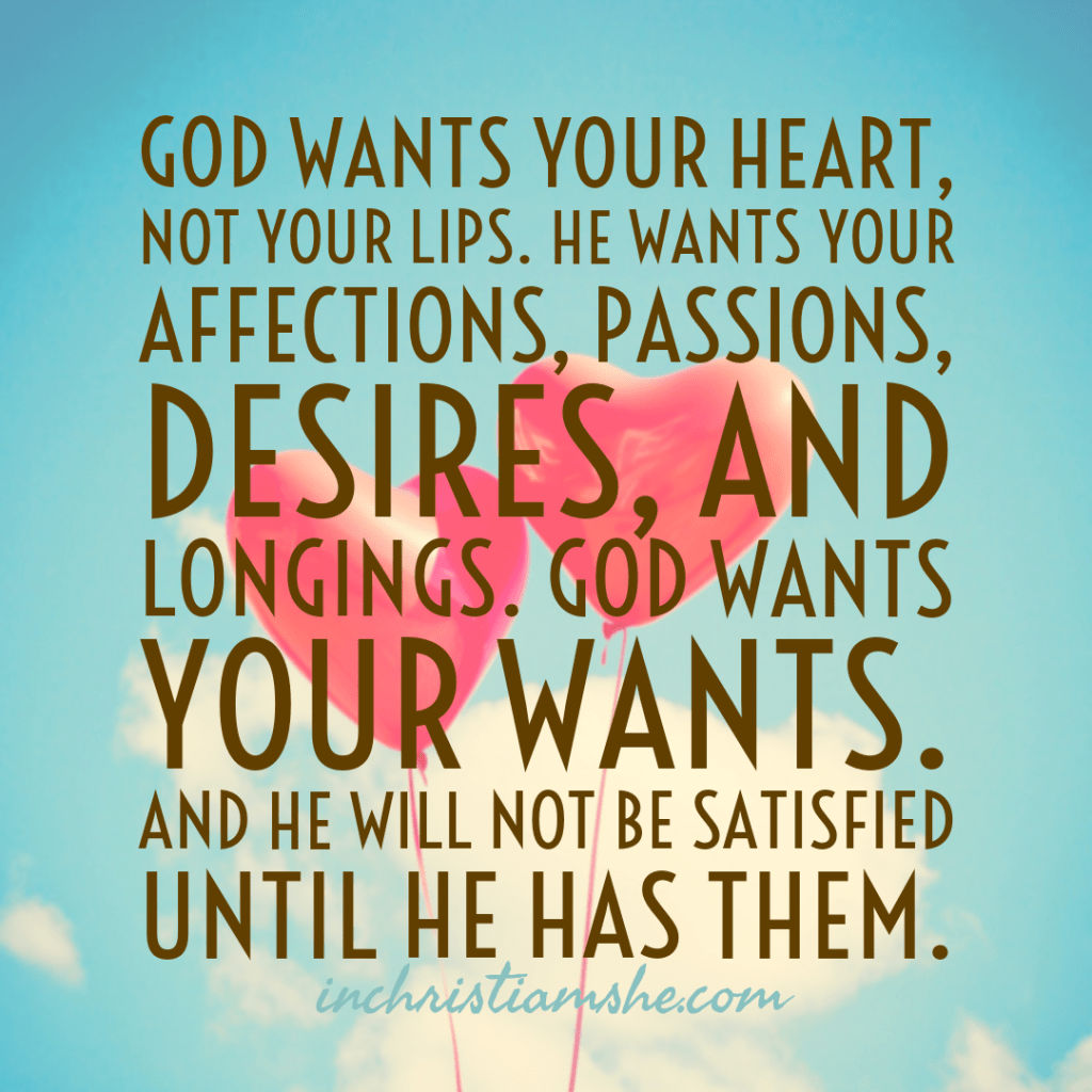 God wants your heart, not your lips. He wants your affections, passions, desires, and longings. God wants your wants. And he will not be satisfied until he has them.