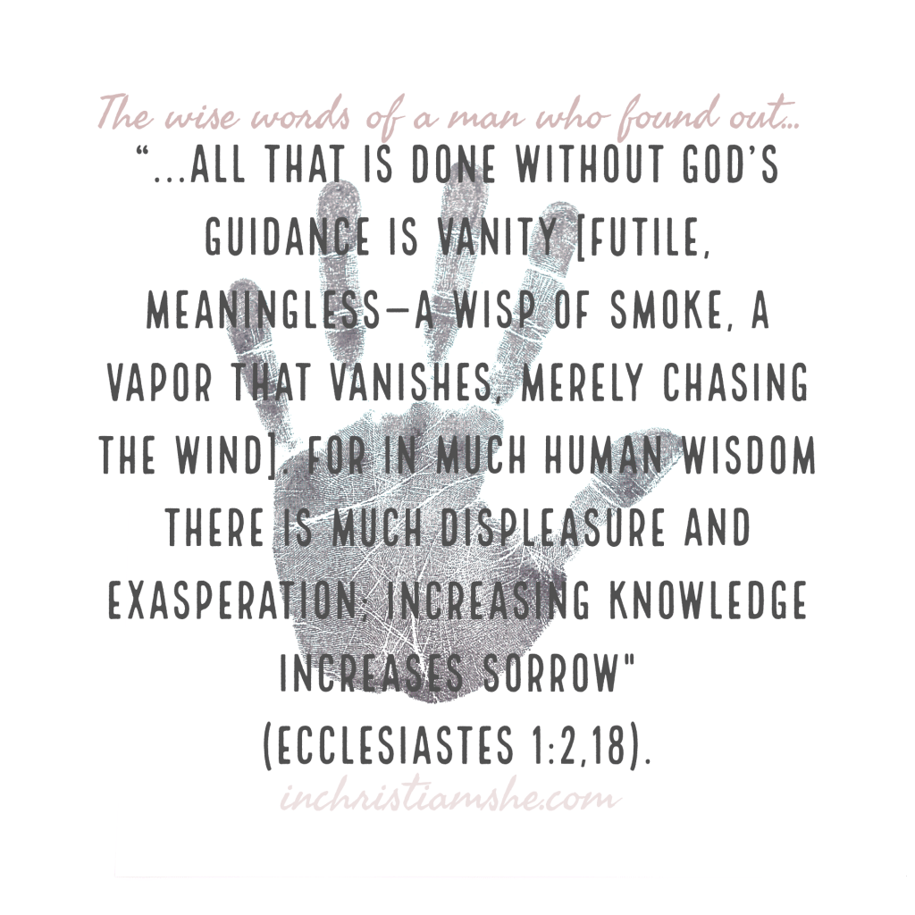 When Wisdom Speaks, do we Listen? 0 March 7, 2022 Written by In Christ I am SHE [Colleen Woodruff] Take it from me, I found out the hard way. -King Solomon- In Christ I am SHE {Saved. Hopeful. Empowered.} Thanks for Sharing this post: Click to print (Opens in new window) Print Click to share on Facebook (Opens in new window) Facebook Click to share on Pinterest (Opens in new window) Pinterest Click to email a link to a friend (Opens in new window) Email Click to share on LinkedIn (Opens in new window) LinkedIn Click to share on X (Opens in new window) X Click to share on Tumblr (Opens in new window) Tumblr Like Loading... Related